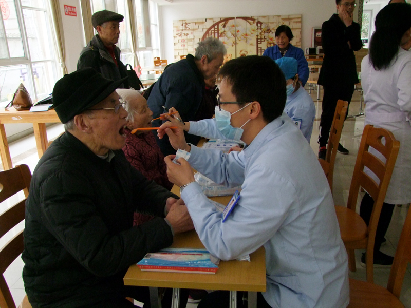 市口腔医院医务人员为护理院老人们介绍口腔保健知识,进行免费的口腔检查,并发放宣教手册、牙膏、牙刷等口腔用品,帮助老人们解除口腔疾病方面的疑惑,掌握正确的口腔保健方法。活动现场,老人们排起长队,有序接受治疗。