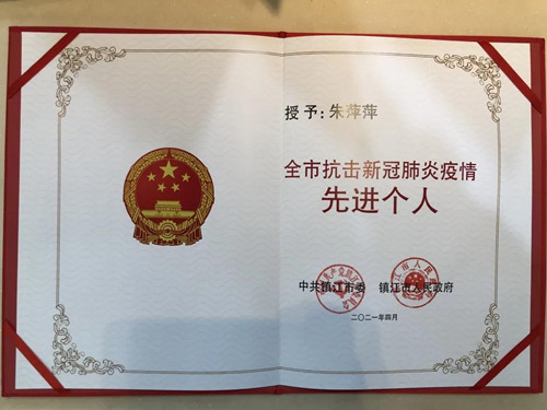 我院分诊服务台护士朱萍萍荣获“全市抗击新冠肺炎疫情先进个人”。