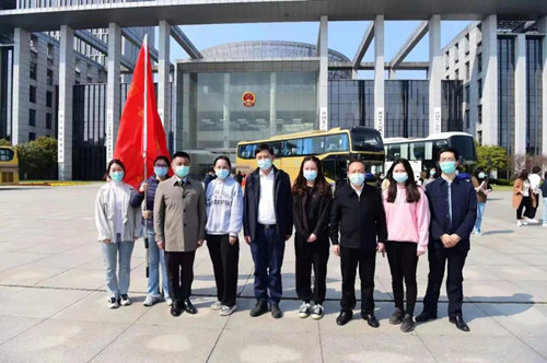 4月3日,市卫健委主任杨毅以及相关领导为队员们送行并合影留念。
