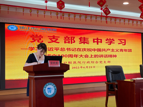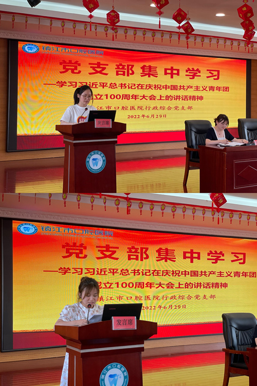 为深入学习习近平总书记在庆祝中国共产主义青年团成立100周年大会上的重要讲话精神,进一步提升党组织政治功能和组织凝聚力,6月29日下午,市口腔医院行政综合党支部全体党员、发展对象、入党积极分子在八楼会议室参加了本次集中学习。