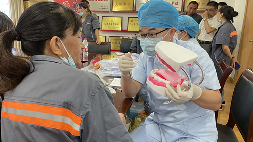 活动现场,我院“小白牙”志愿者团队为到场的环卫工人进行了一对一的口腔检查,对有口腔问题的人员,做出了详细的健康指导及治疗建议。环卫工人把精力更多放在城市整洁上,往往忽视了口腔健康。他们很多人存在牙齿缺失情况,而牙齿缺失很多都是由于牙周炎引起来的。因为牙齿长期清理不到位,牙面上会有大量的菌斑、结石,它们长期堆积在上面,会刺激牙龈,进而导致牙龈出血,牙龈萎缩,牙齿松动脱落。所以我们针对有牙周病患者建议他们首先要进行洁治和完善的牙周治疗。