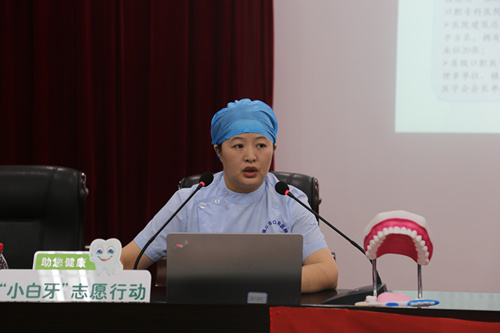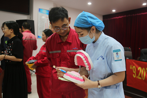活动现场,市口腔医院的“小白牙”志愿者耐心为企业职工检查牙齿,并根据每个人口腔问题的实际情况,给出专业的治疗方案和护理建议。同时志愿者们向大家宣传关爱牙齿、口腔保健的小知识,提醒大家养成良好的口腔卫生行为习惯和饮食习惯。
